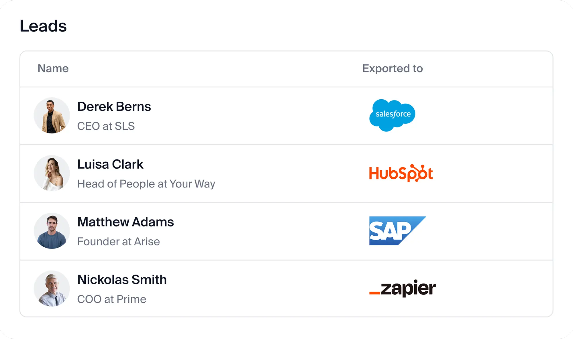 Scan paper cards, digital profiles, QR codes and event badges. AI reads every detail, extracts the contact information and automatically saves it to your CRM in seconds.